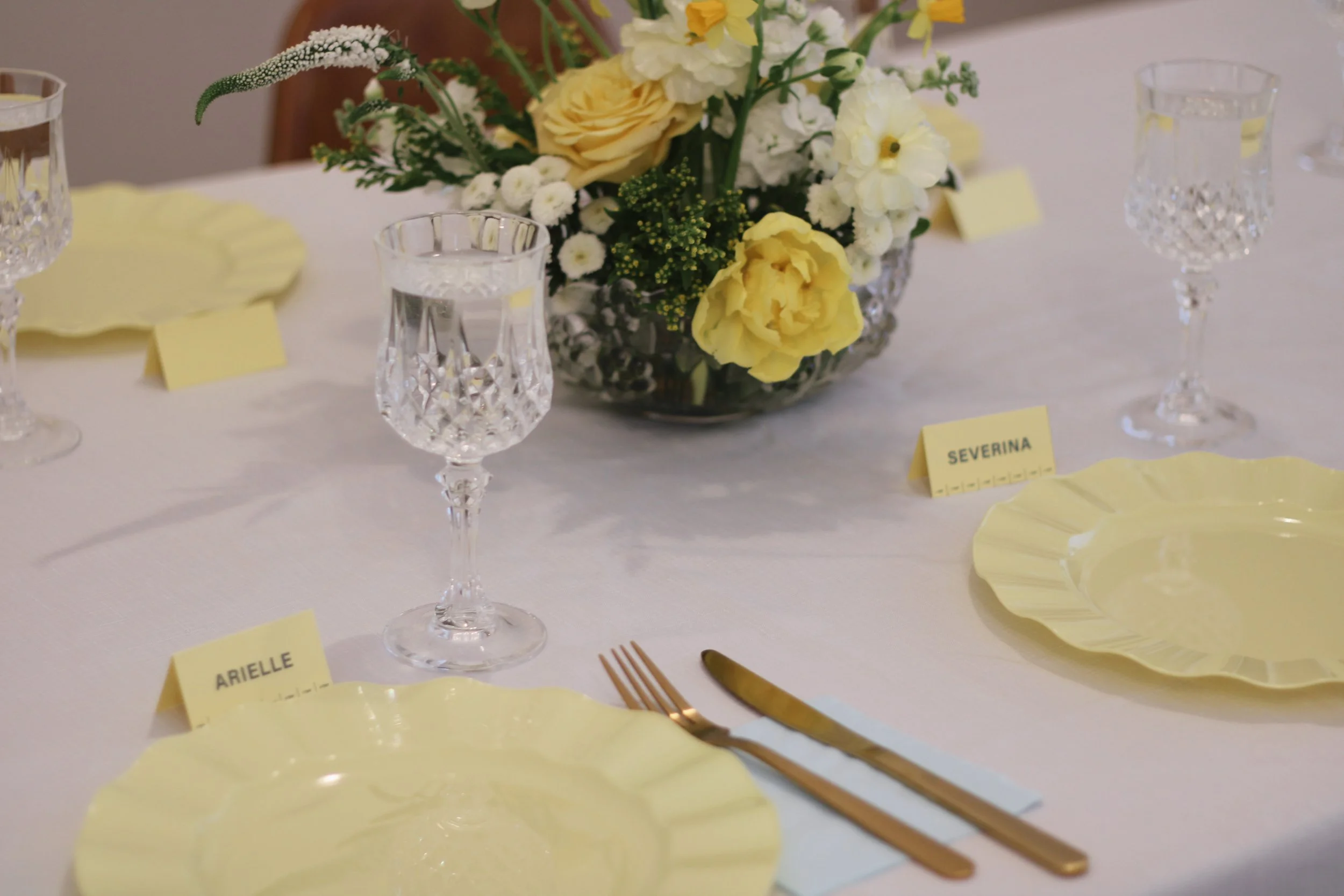 Obviously, I went with a light butter yellow color scheme with pops of blue throughout. I designed a custom banner made to look like a stick of butter and had it printed at smartpress.com — it came out at 36x24" and was the perfect size. The tablescape stayed pretty simple: I found the cutest scalloped yellow plates and light blue napkins to pair with the gold silverware I use for most of my parties. I also made name cards shaped like little butter sticks to tie it all together. The centerpiece was a big floral arrangement overflowing with white, yellow, and blue flowers. And of course, there was a second little banner hanging by the drink table that read: "life is butter with you."